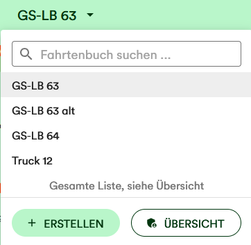 - Wählen Sie Ihr Fahrtenbuch in der linken oberen Ecke unter "Übersicht" aus
